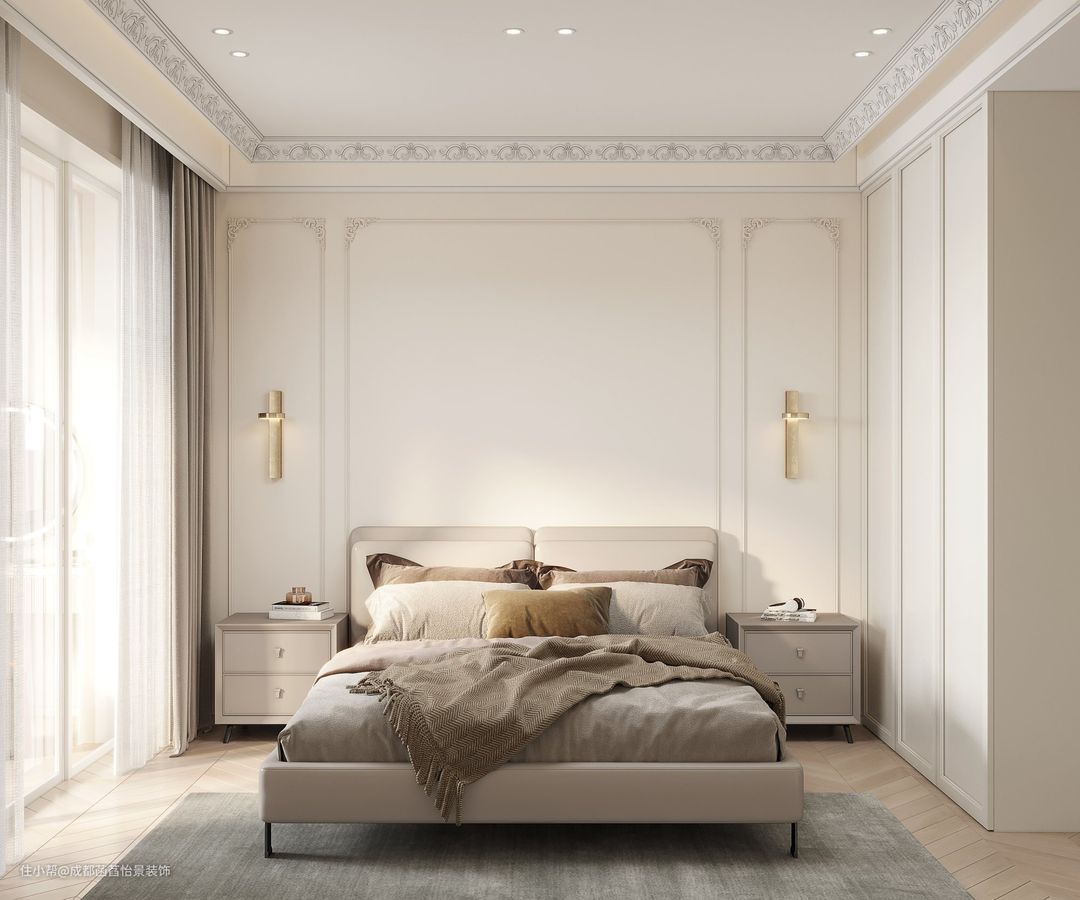 卧室的布置素雅舒适,一张灰色调的双人床搭配着床头两侧的壁灯,定制的柜子做的到顶的设计,营造出一个精致的空间氛围。