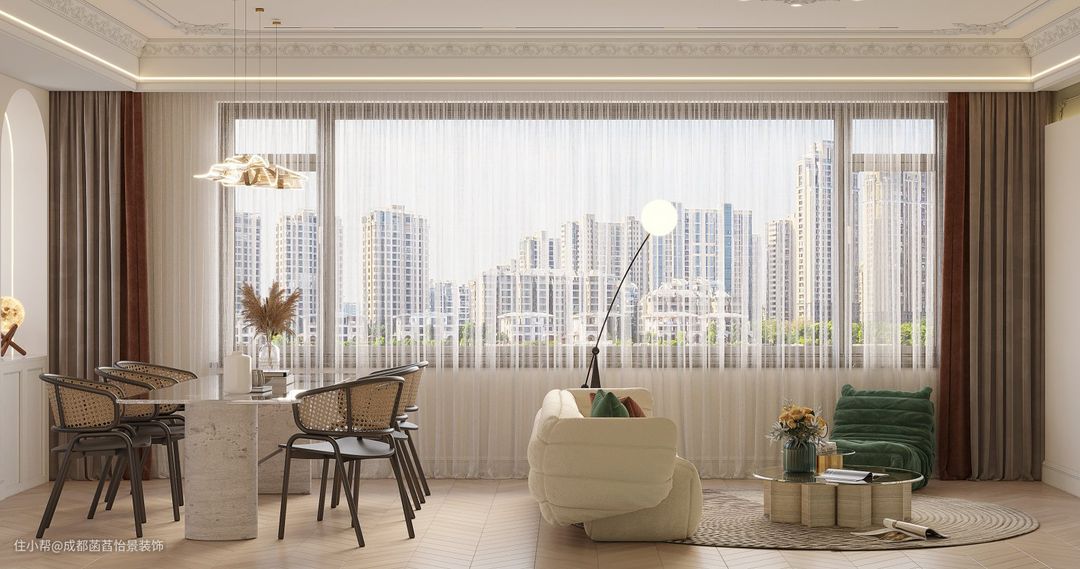 客厅没有做传统的空间布置,没有电视机,电视柜,利用沙发与圆形茶几打造一个柔软舒适的公共空间,阳光透过窗纱,照进室内,温柔舒适。