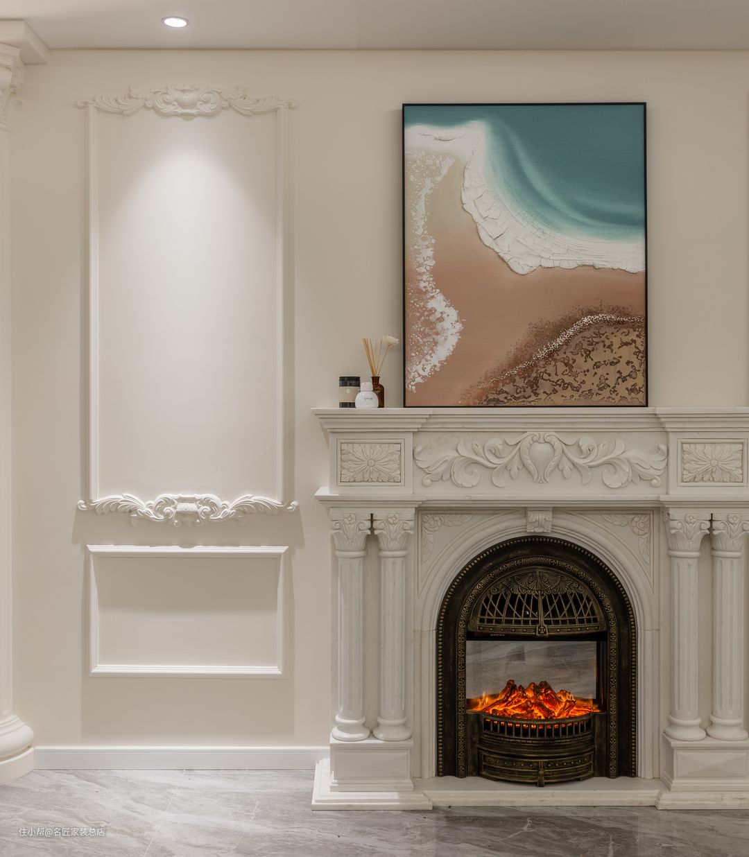 作旧的金属壁炉装饰、法式廊柱的细节处理、雕花的制作工艺、颜色治愈的海面装饰画,客厅一角的装饰精细考究,整体搭配起来既有法式情调又有实质性的作用。