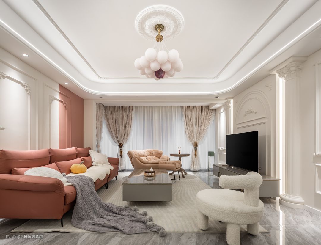 客厅一眼望去,以柔软的复古元素填满,粉色调营造出浪漫的氛围。墙壁采用白+粉的撞色艺术墙,粉色布艺沙发与之对应,柔软的地毯,羊羔绒的单人椅......Ins风家具陈设,为屋主带来治愈的居家体验。吊顶线条柔和流畅搭配气球形状的吊灯,满满的童话气息。