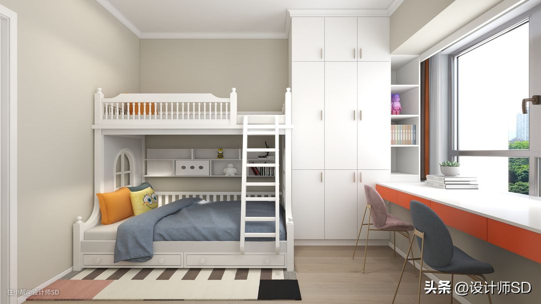 儿童房没有按照常规的布局,而是使用了高低床放置门这侧,靠近窗户则用来做衣柜跟书桌,窗户下通风采光都比较舒适,而且外景也很好,用来写作业很合适哦。