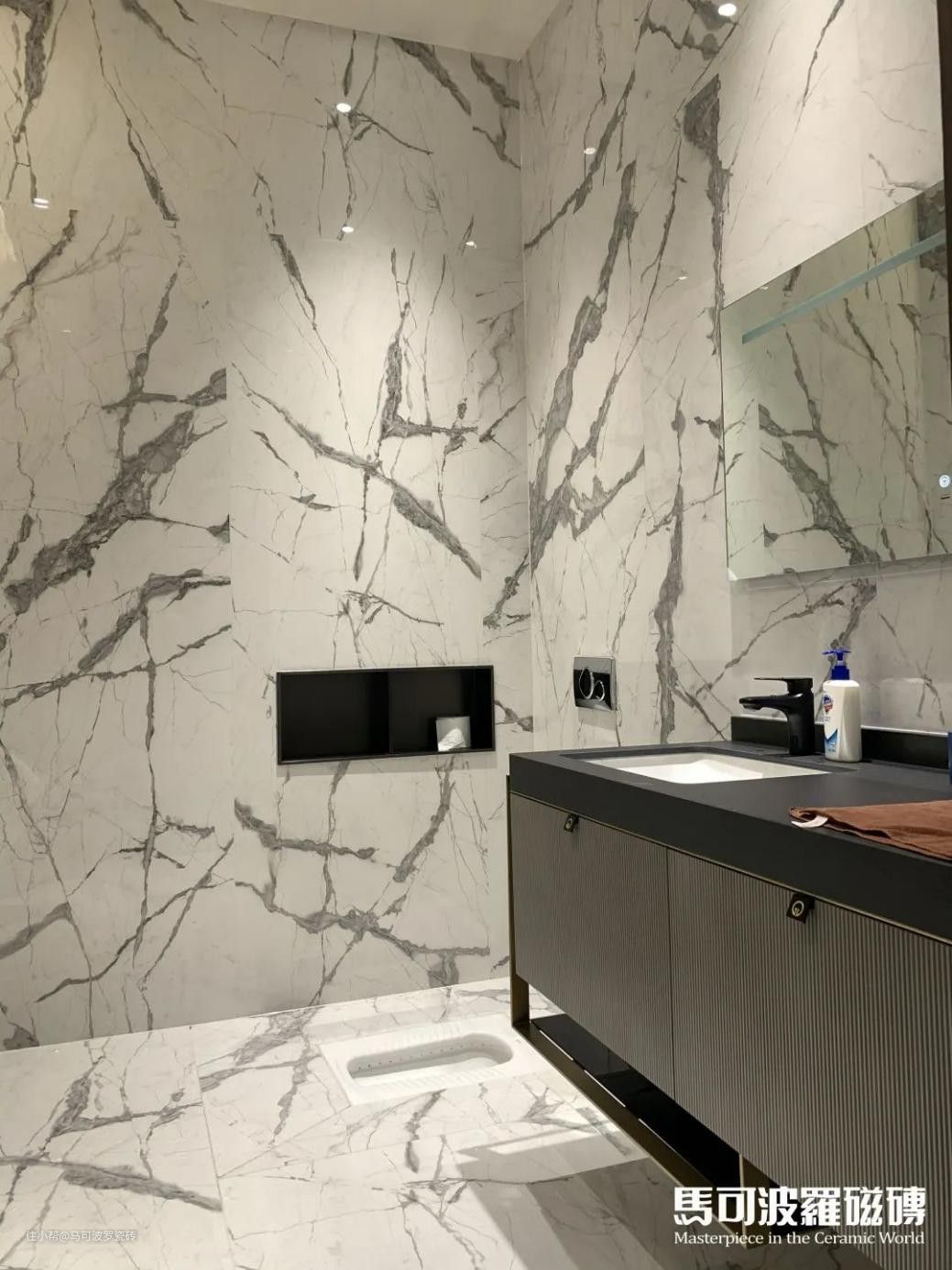 卫生间墙、地面都选用了马可波罗寒江雪,灵动自然,意境唯美,高级感呼之欲出。在产品开发上,马可波罗大部分产品都有配套开发,一个花色,有多种规格,既能“上墙”,又能“下地”,满足全空间的铺贴需求。