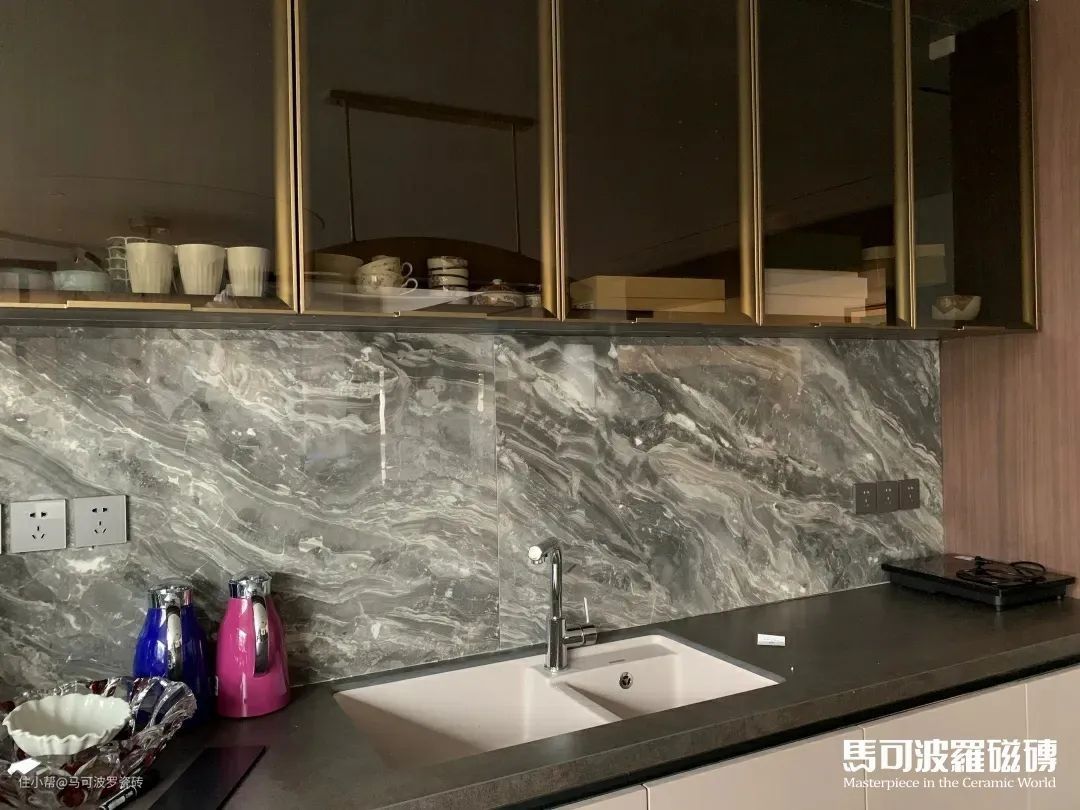 厨房墙面选用的是纹理流动的威尼斯棕,表面极高的致密性不容易藏污纳垢,且易于清洁,使用抹布轻轻一抹就能光洁如新。