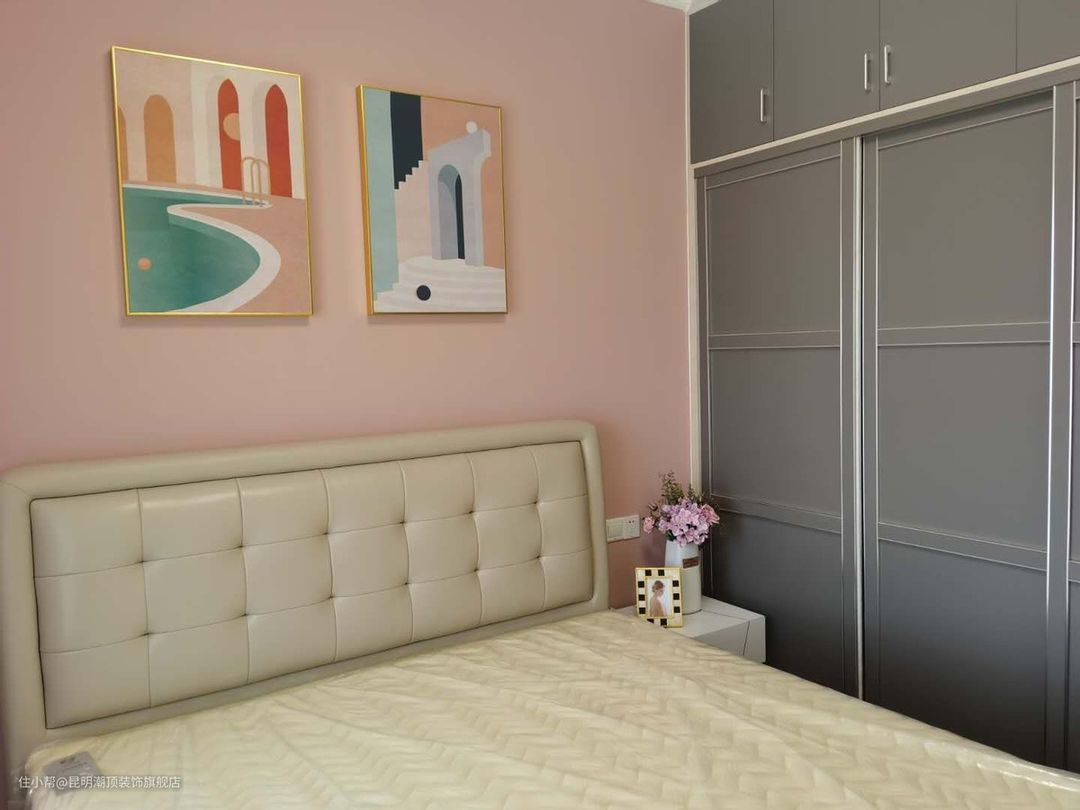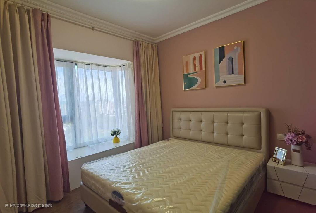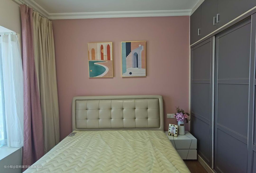 一张舒适的大床,粉色的布帘,风色的床头墙,原木的地板,搭配一些软式装饰弥补房间的空缺,暖阳可以肆意的洒满整个房间。