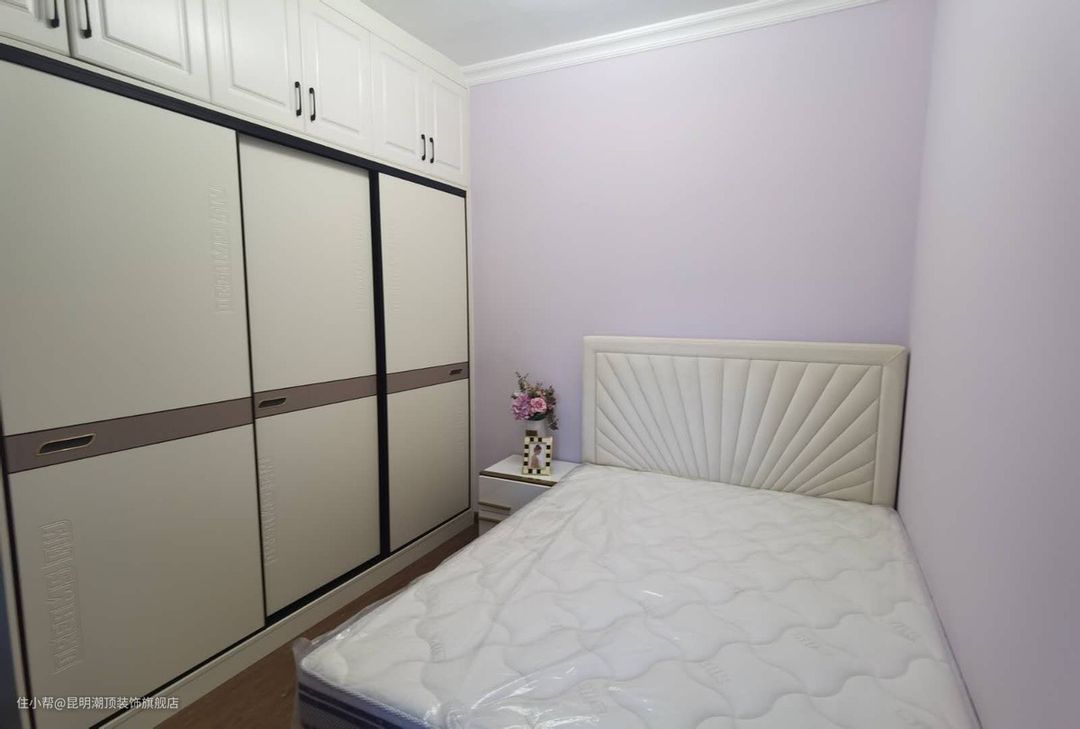 浅紫色的墙面包裹整个房间,她既保留了紫色的神秘浪漫气息,也杜绝了紫色的沉思,搭配一束鲜花,整个空间给人一种清爽的浪漫气息。左侧黑线条镶边的衣柜也满足各种收纳功能。