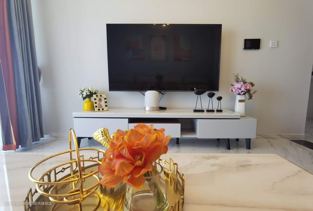 白色的电视背景墙和白色的电视柜,无需过多的装饰,简约的小花瓶装饰即可,浅色的搭配,更能突出视觉的中心焦点。