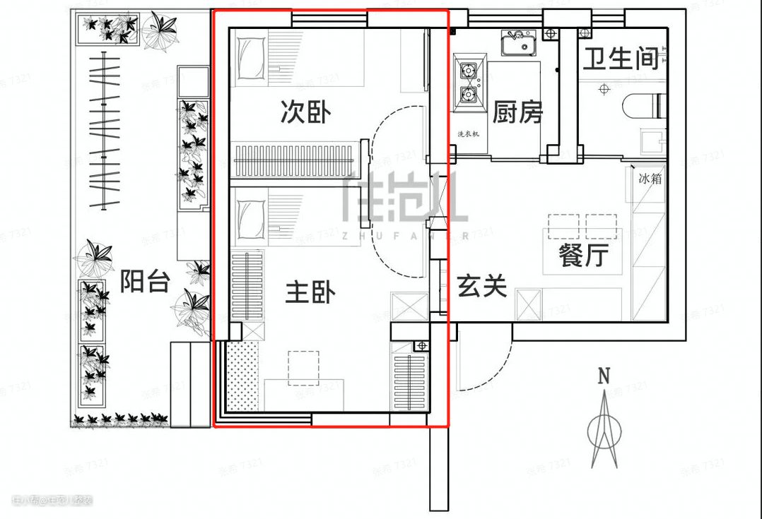 下面的卧室布局,是一个套内不到40㎡的小一居,卧室占了超过1/3的面积。