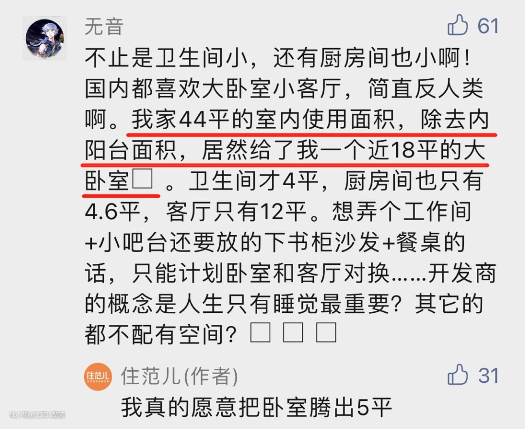 与之相反的,公众号后台很多小伙伴留言,说卧室小一点没关系。
