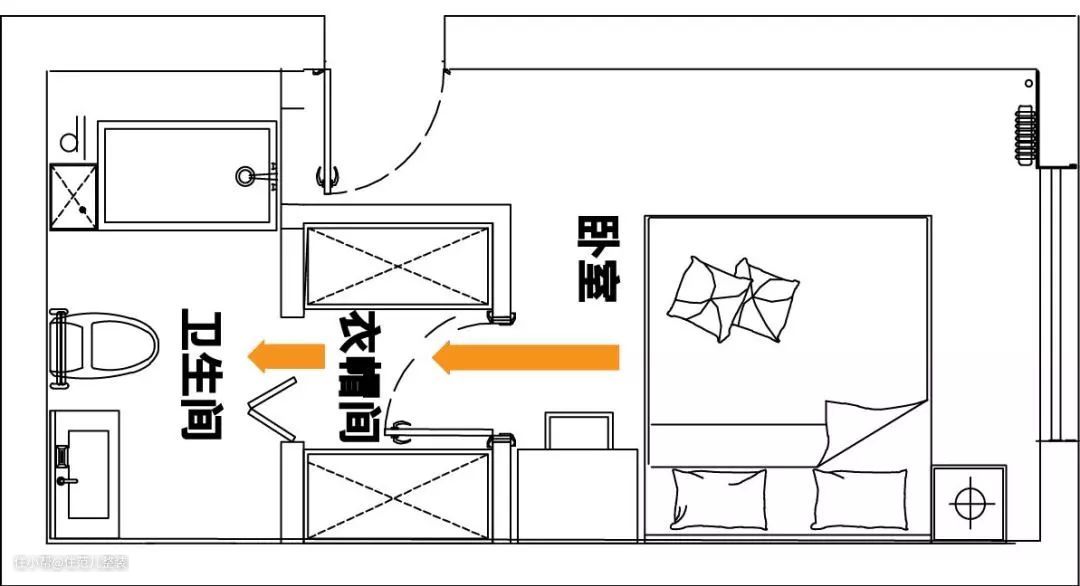 衣帽间与卫生间共用同一个入口,早晨起来从卧室到衣帽间换衣服再到卫生间洗漱,一气呵成。