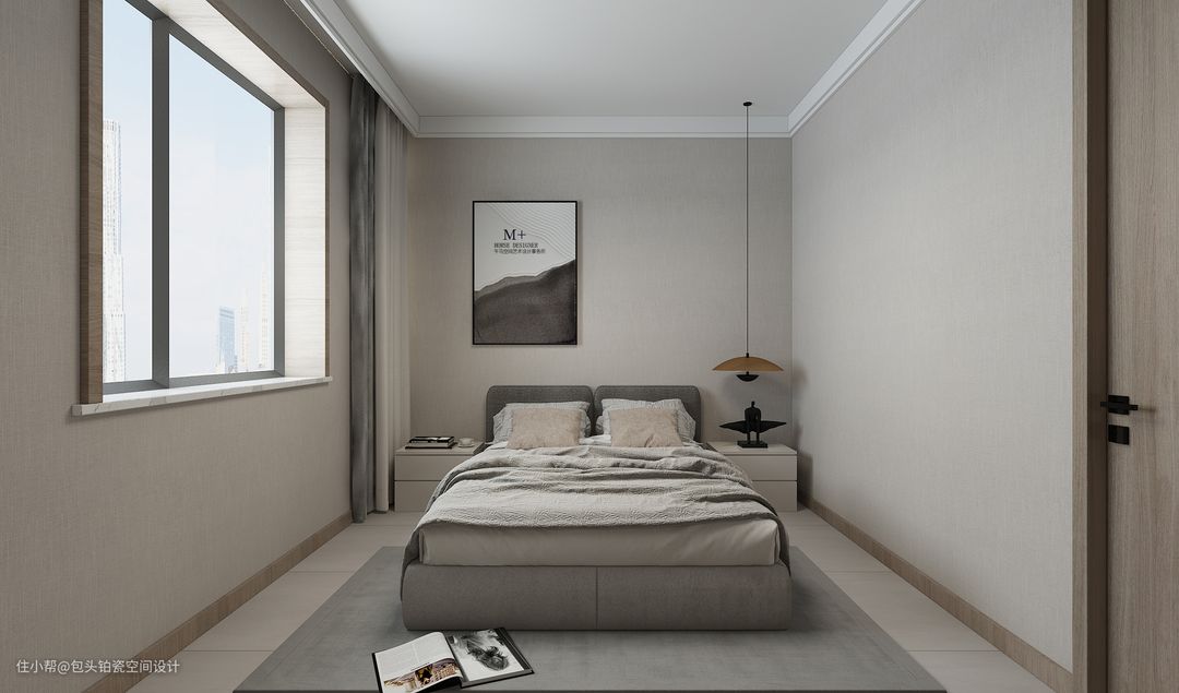对称床头柜属于较为常规的选择方式,材质或颜色与床或背景墙有一定的呼应、符合空间尺寸及居住者需求即可。