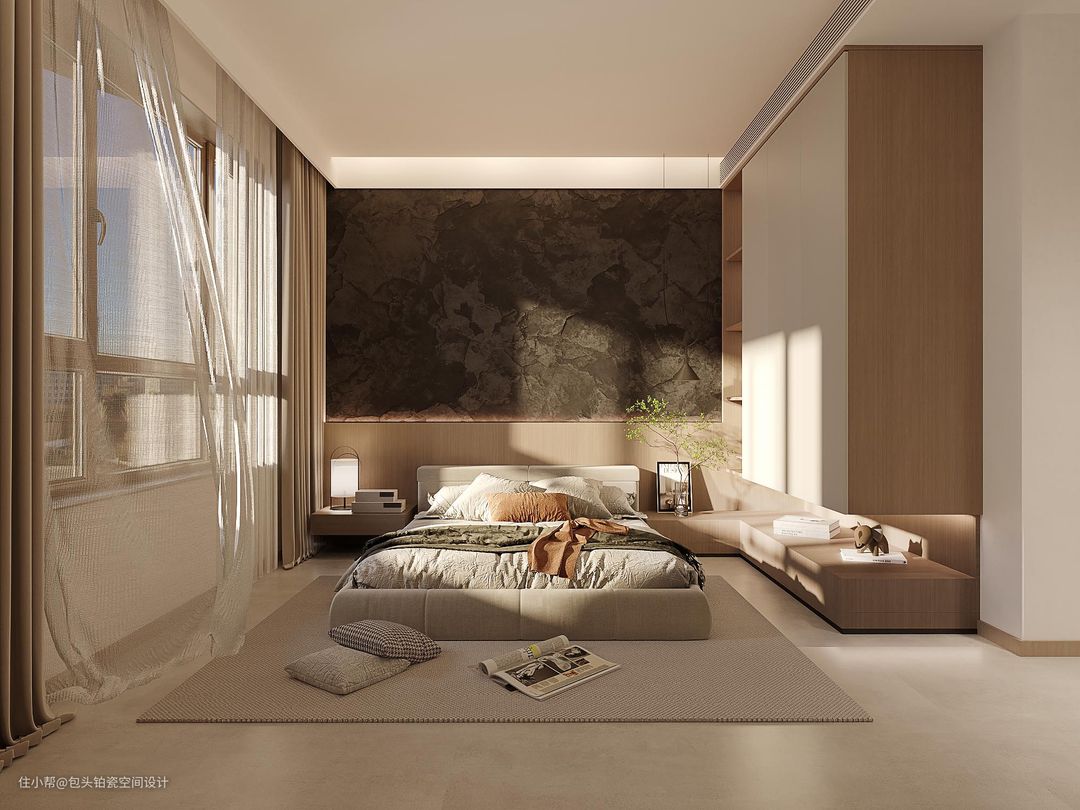 背景墙为石材+木饰面,暖光的条形灯带打在石材上,增加层次感,也增加了空间的温度。靠窗一侧做悬空柜体,衣柜一侧,做L型地柜,收纳、展示功能兼具。