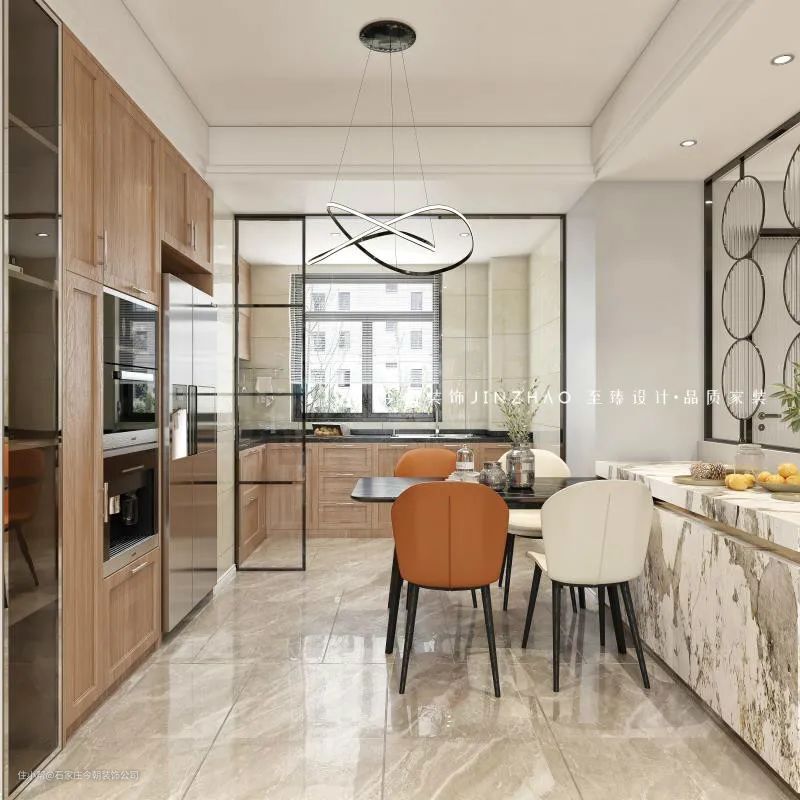 ▲餐厅与为卫生间质检用圆盘造型透明玻璃隔断,黑色餐桌与边框搭配白色大理石岛台,轻奢有度,质感时尚。