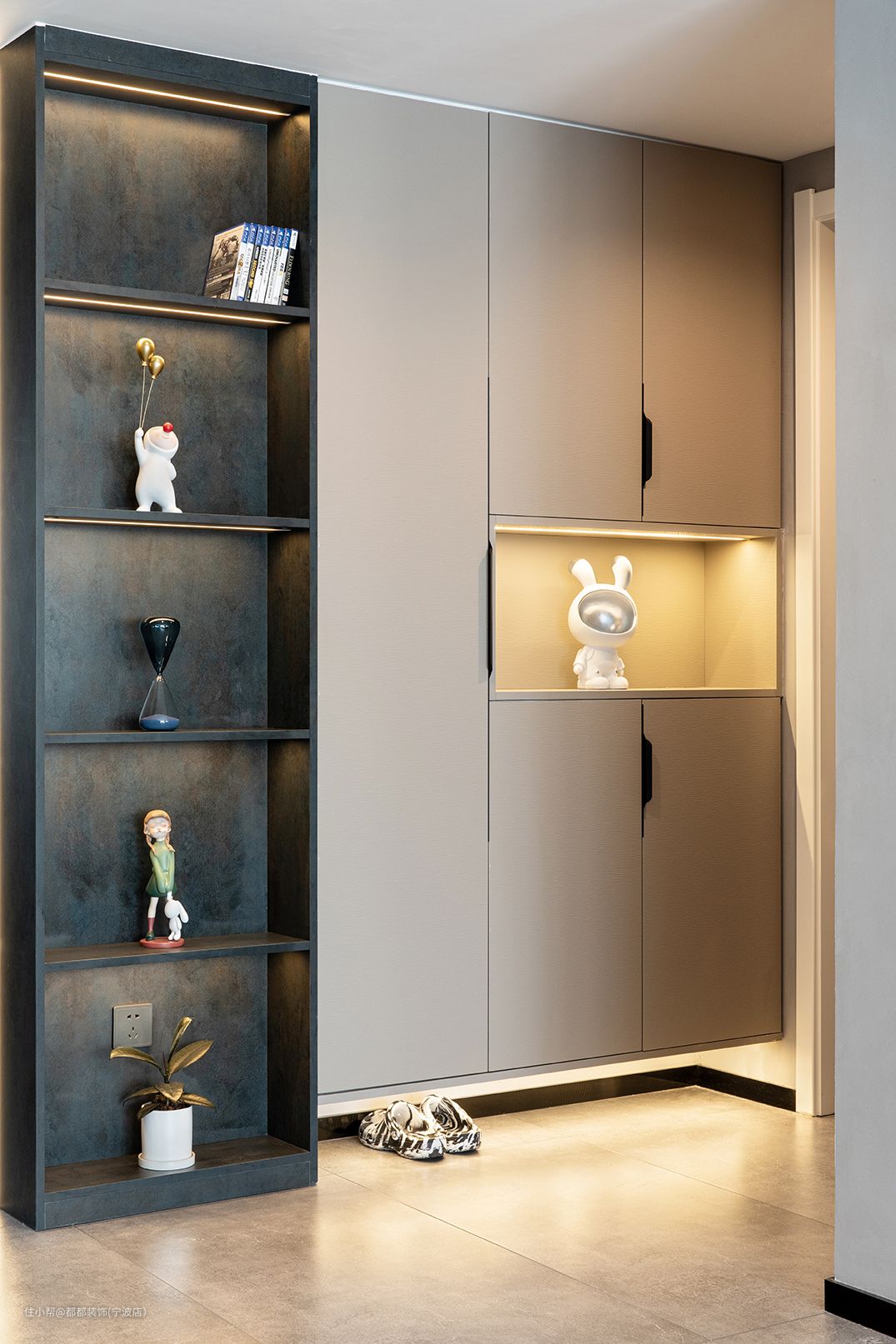 玄关一定要有感应灯光,柜内辅助灯光,找东西会更加方便,玄关通道的距离不能小于1m,设计成嵌入式玄关柜美观又好看。