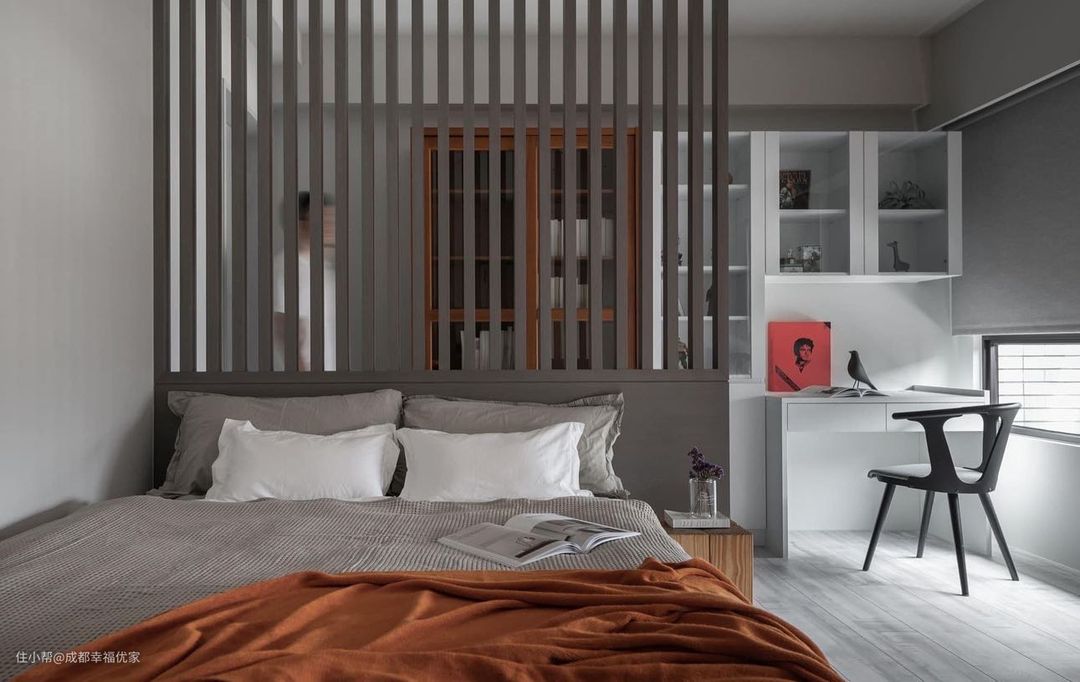 灰色格栅隔出了一间小书房,十分具有层次感,且格栅比墙体的通透性更好,可以减轻避免卧室产生压抑性。