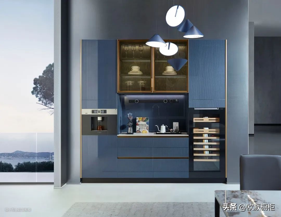 《星月夜》便是典型的西厨餐厅柜代表。采用蓝缇为主色调,轻奢风强烈,顿显设计感与价值感。灯光下微微泛着珠光的门板,于理性中增添一丝柔和,透露着极简美学上的独特高级感。