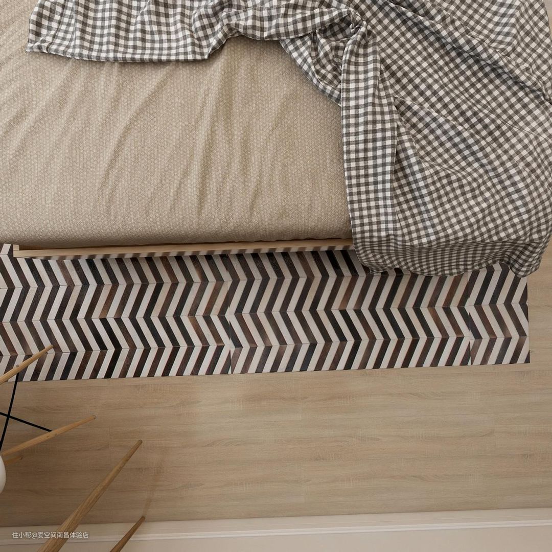 因为墙面,地板和家具都选用了同一色系,所以在床品上用了另一种色调,做为点睛之笔。这样不会让卧室太刻板,黑白相间的床品和地毯让整个空间更加灵动,增添了一点趣味感,而黑白色也能和原木色呼应到一起,不会太突兀。