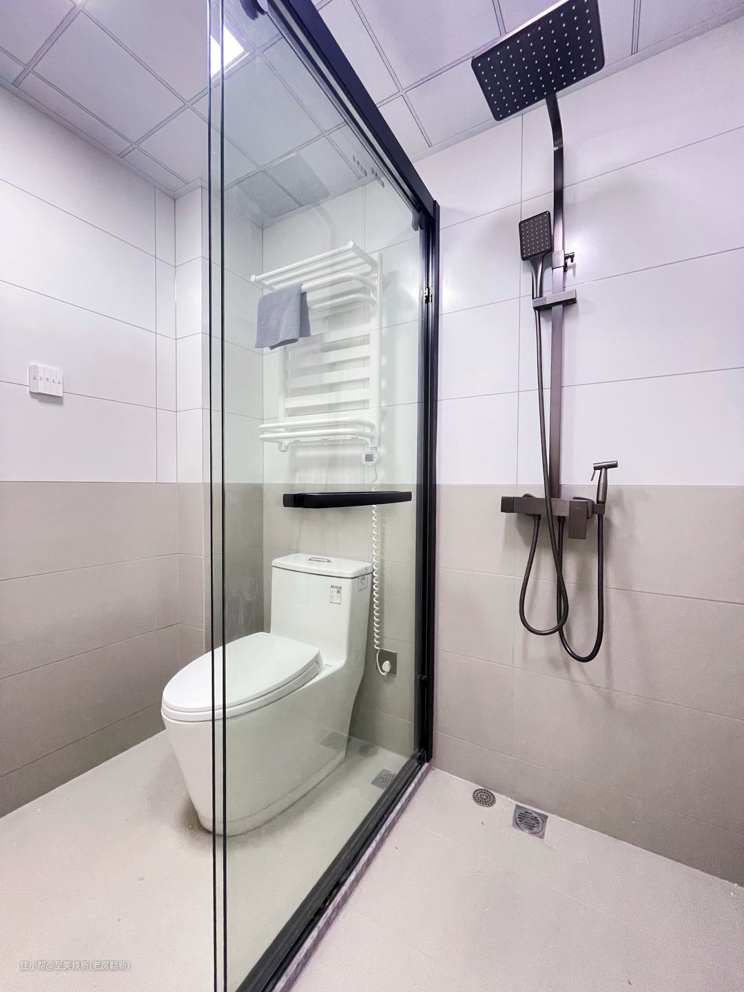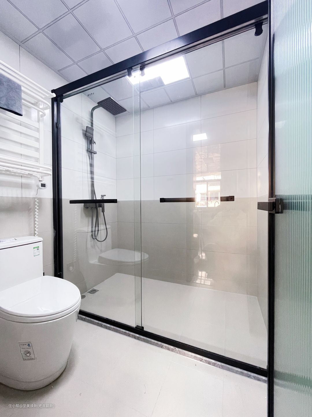 卫生间用黑色金属边框玻璃推拉门做出干湿分离区域分割,既便于卫生间清洁打扫保持室内干爽,也方便早高峰时段错峰使用不同功能卫生间。