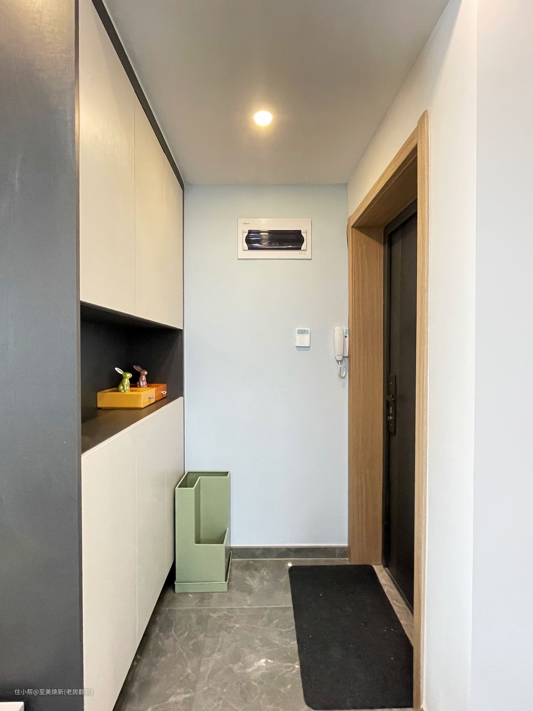 相比翻新前的柜子削减了厚度,使玄关区域的空间位置要稍微大一些,在视觉上减少压迫,拥堵厚重的感觉。整体简约灰和淡雅白的颜色拼接搭配,更显现代时尚的气息。
