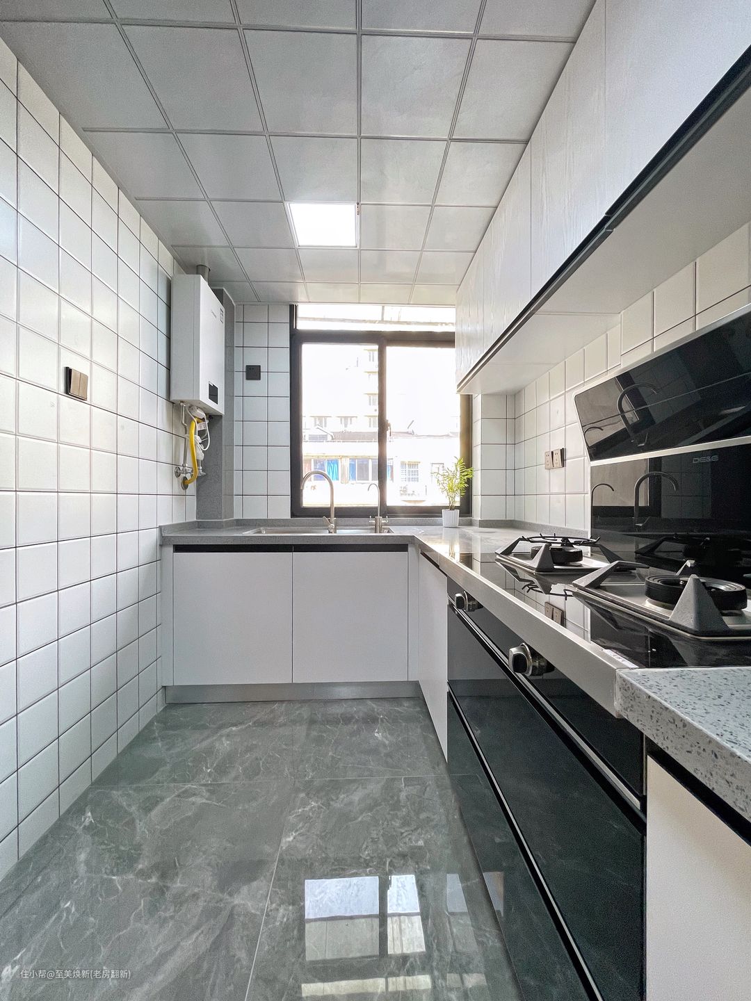 灰色大理石纹地砖与黑色灶台更便于日常厨房清洁维护,由于空间大面积白色所以黑色少量点缀分割区域不仅不压抑,反而更有设计更时尚。