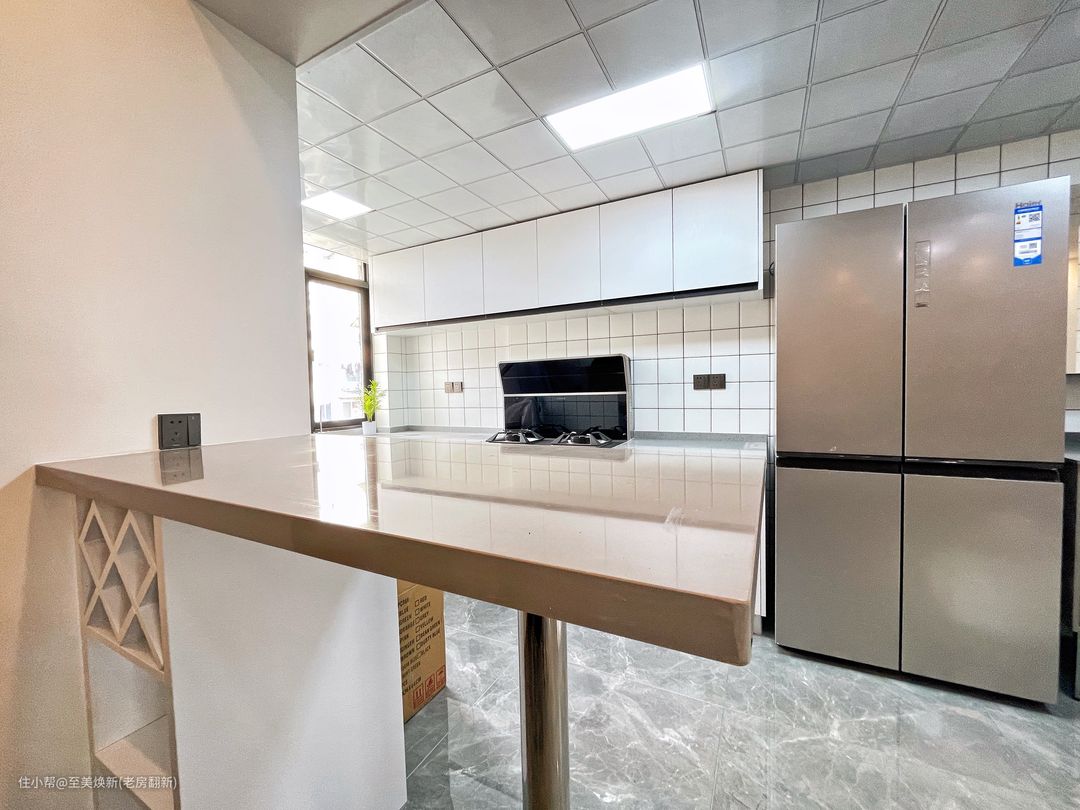 厨房半开放式以小吧台代替门的设计,为厨房区域增加一个功能区,一侧的井字形格子柜可以摆放酒水,饮料,在闲暇周末,家庭聚餐时小小的吧台更有生活仪式感。