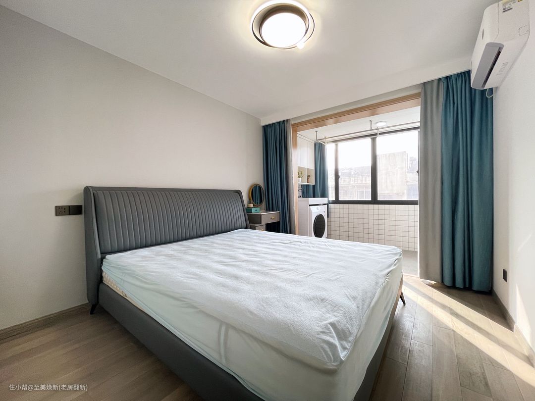 卧室阳台与室内打通用青蓝色和灰色双层窗帘做一个空间区分,白天拉开窗帘让室内空间视野更加开阔,将窗外景色收入。