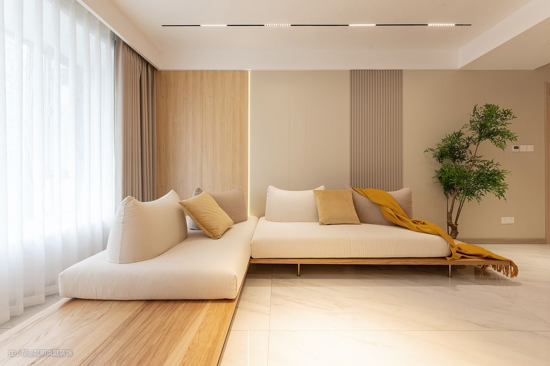 沙发造型较为时尚个性,底部是用木材定制的L型台面,上面直接放上布艺软垫,简简单单又温温柔柔。米白色的软垫上有色彩偏向鲜艳的抱枕与毛毯,为素雅的空间增加了一抹靓丽色彩。闲暇时躺在沙发上看看书,不失为一件雅致又幸福的事情。