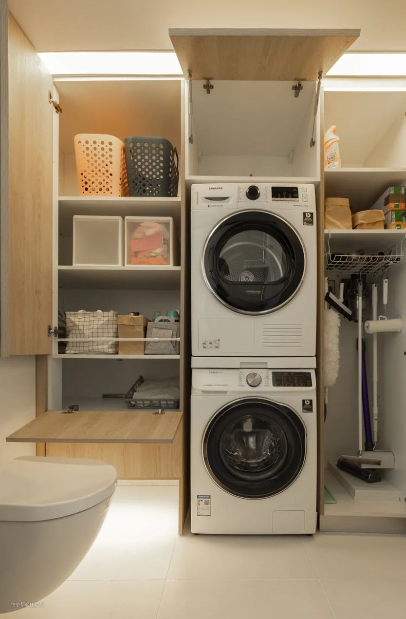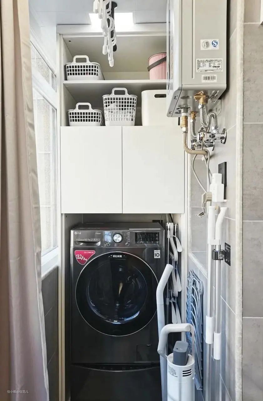 还有现在大家都喜欢去做的家政柜,也是利用了柜子里面的垂直空间,预留上插座,就可以将吸尘器等清洁工具都归纳到一起,不再占用地面上的空间。