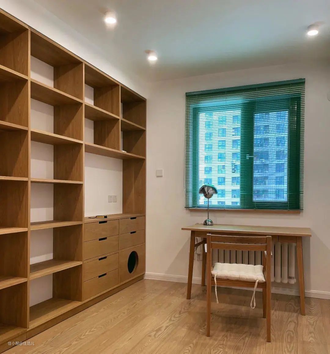 一直很流行的一体式书桌,集墙面收纳和桌面为一体,提升了桌面和墙面的收纳效率。