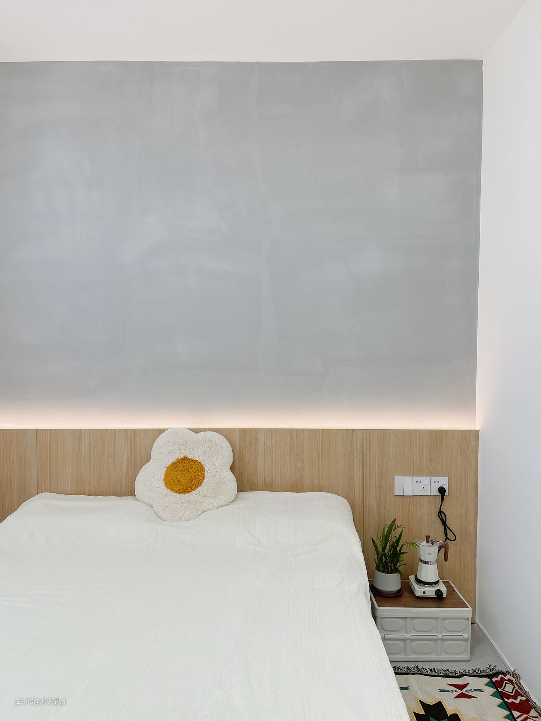 简约的灰色延续了家里其他空间一贯的极简风格,卧室床头背景墙用灰色漆涂刷(多乐士大象灰 46YY 33/057),其余大面积墙面刷白漆(多乐士 11GY 85/061),简约又百搭,搭配原木色的床,极简又清爽。