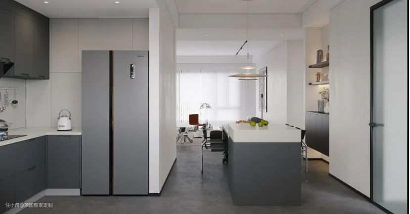 一门到顶的储物柜及L型地柜,为厨房收纳增添了许多空间,嵌入式厨房电器+分区明确的洗切区、烹饪区,用餐后收拾完厨房又能洁净如初。