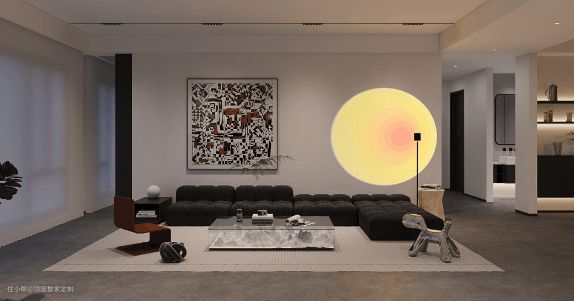 白墙上摆设具有现代气息的壁画,公共区域显得十分干净。搭配LED圆形投影灯,白天有窗外良好的采光,家里明亮干净;到了夜幕降临的时候,打开投影灯,家里充满了暖暖的氛围感。