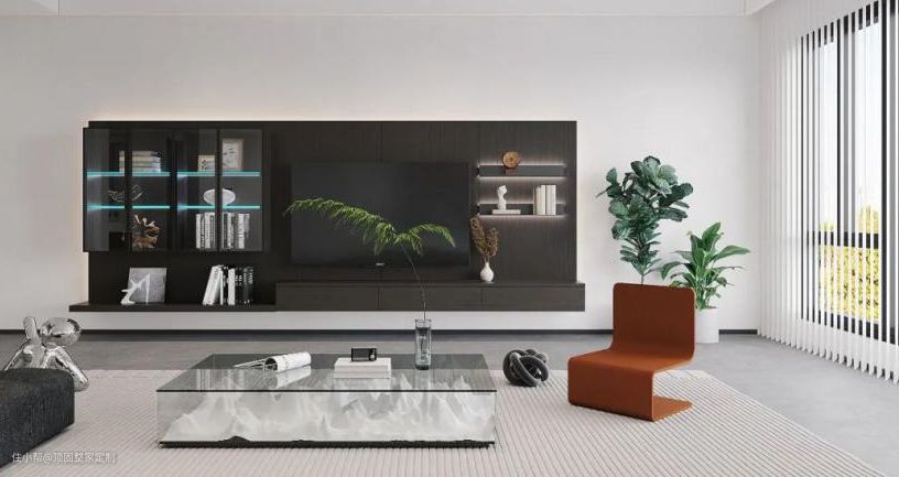 电视背景柜使用了暗黑玻璃格子柜、蓝光LED内置灯带,收纳物品的同时又是一个非常美观的角落。