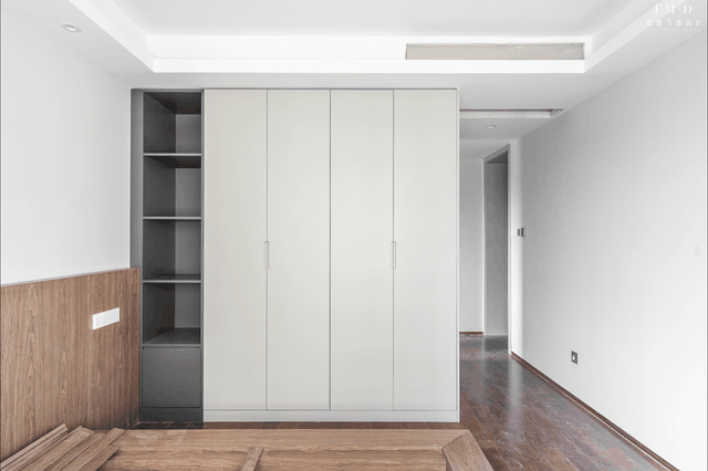 衣柜还特意设计了四格开放区,打破了整面墙柜的单调。开放区可以放书籍,方便睡前看书;也可以放些装饰品。最下面一格,考虑到要放床头柜和拿取不方便,也不便经常打开,就设置了柜门,可以收纳一些不常用的物品。