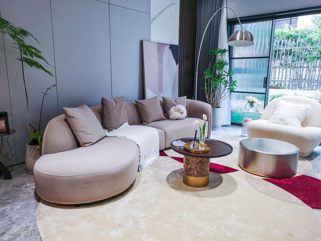 二,弧型沙发或无腿沙发还可以搭配圆形或椭圆形茶几,这种款式的茶几基本是很多小户型的标配,小巧灵活,不占空间,可以随意挪动,如果房间大,可以两个搭配使用,更有气质。