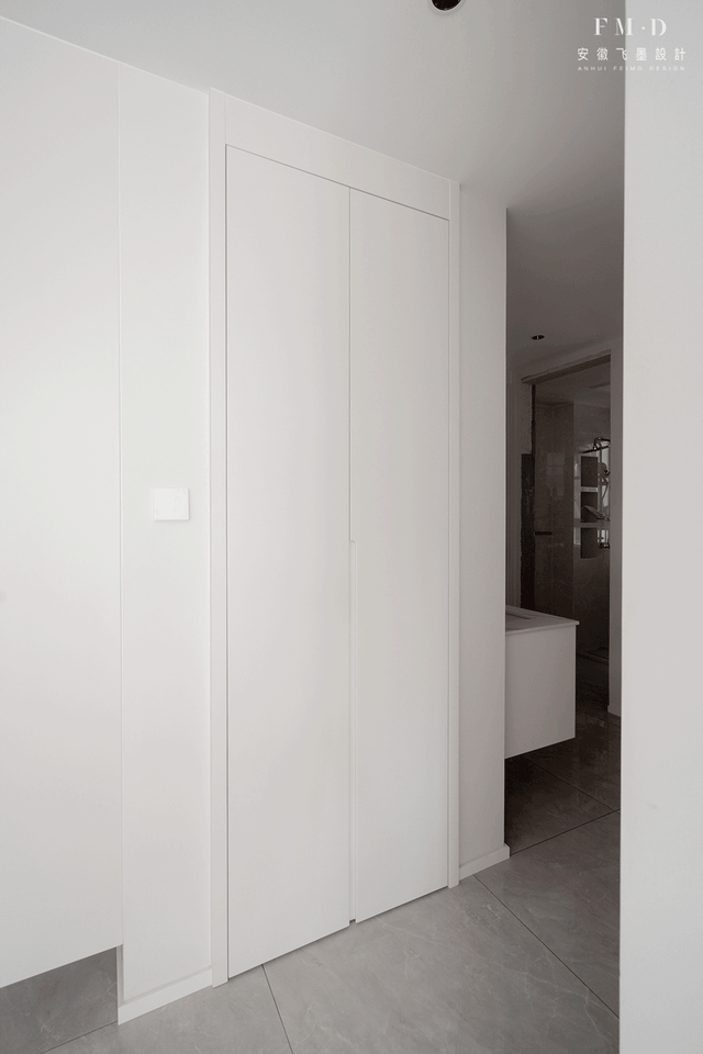 一侧的储藏室安装嵌入式储物柜,白色混油的柜门与旁边的墙面混为一体,加上隐形把手设计,显得更加的简洁大方,丝毫不占过道的位置,使用起来也方便,不用担心落灰。