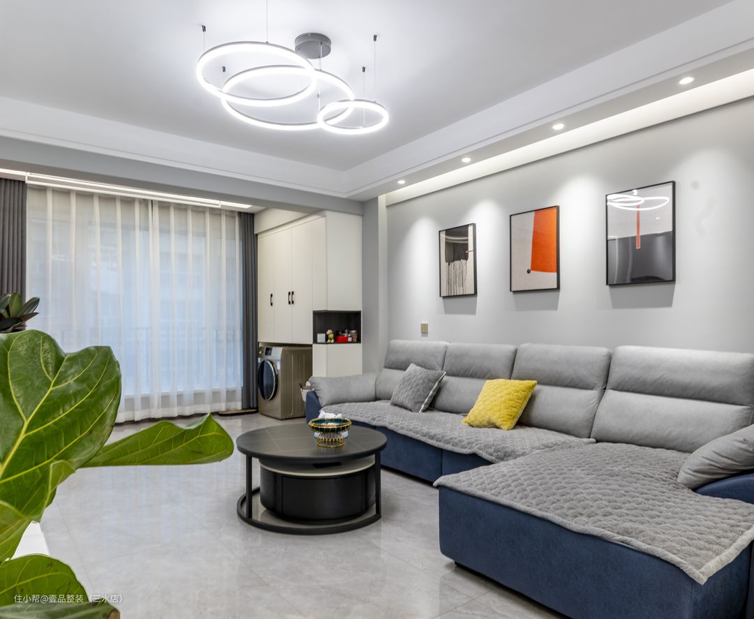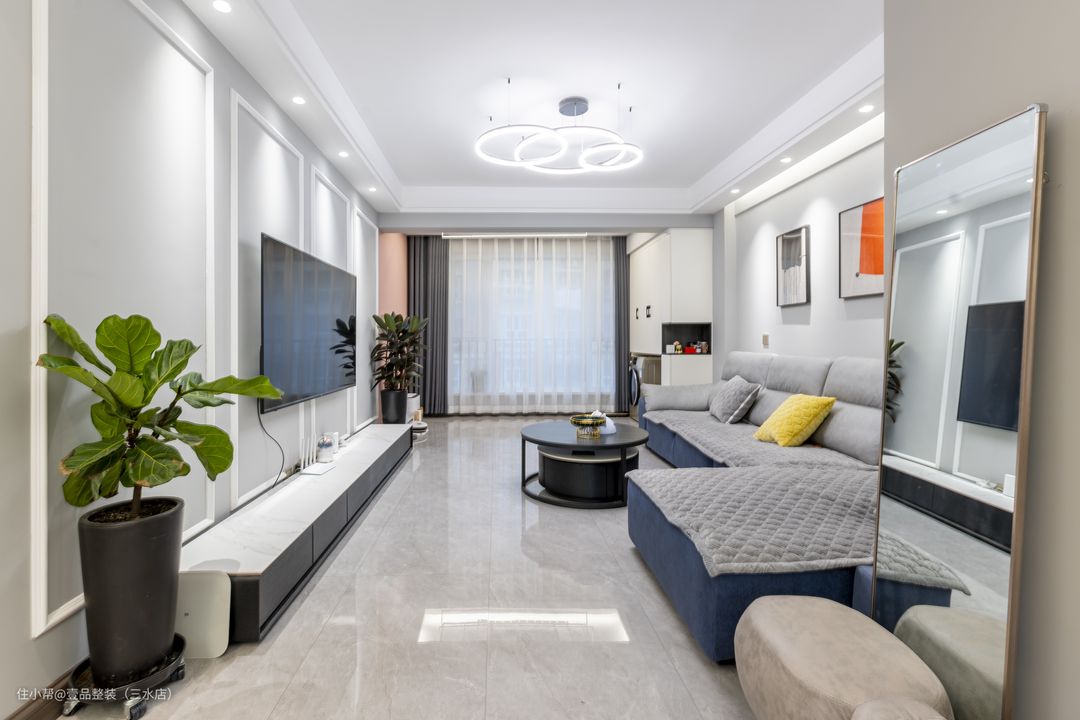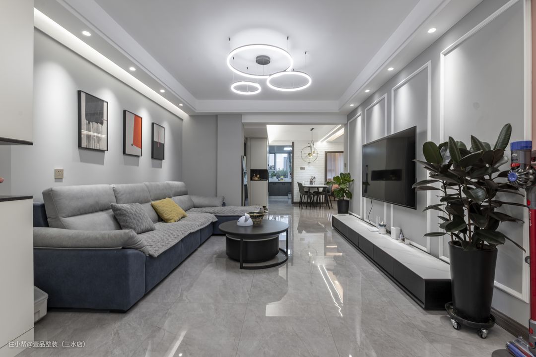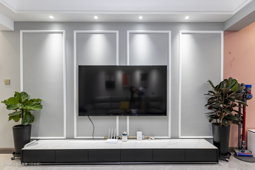 客厅墙面满刷浅灰绿色乳胶漆,电视背景墙用石膏线做点缀,4个白色回字形对称粘贴,中间在水电阶段预埋50的口,以便电线从里面穿过保持整洁。