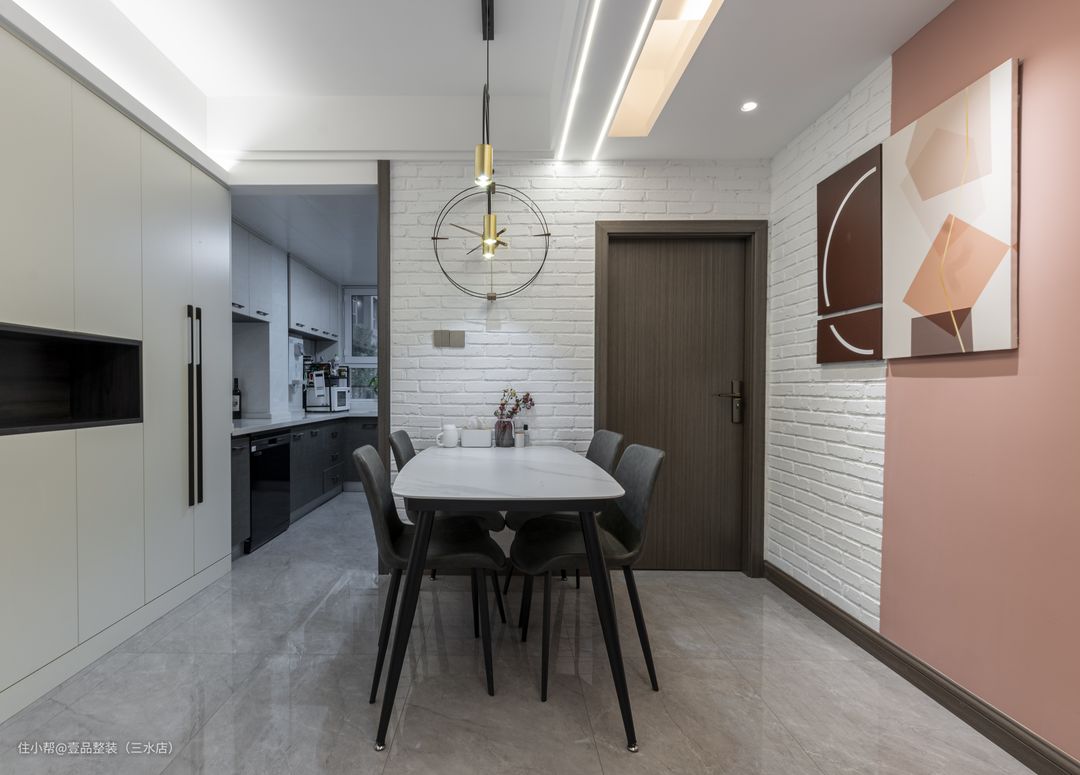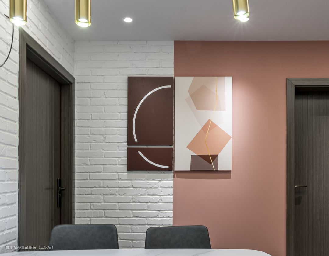 餐厅墙壁采用贴纸+刷漆两种拼接模式,白色壁纸的纹路酷似原砖结构,搭配褐粉色乳胶漆,挂画由3个部分组成,间色明显突出空间层次感。