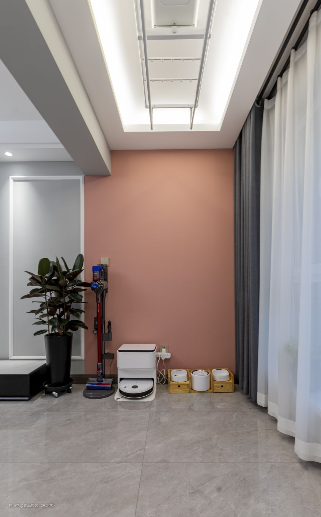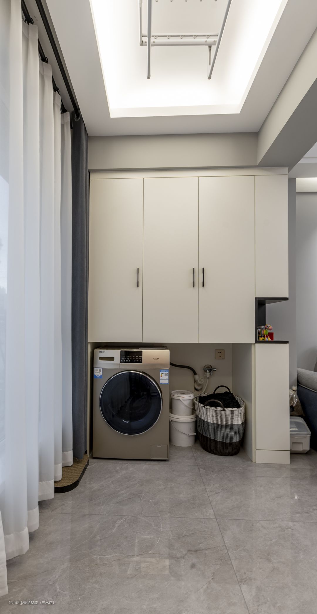阳台做封窗设计,在吊顶内凹位置做灯带设计,中间安装电动晾衣架可随时收回,既不影响美观也不影响上方柜体的使用。