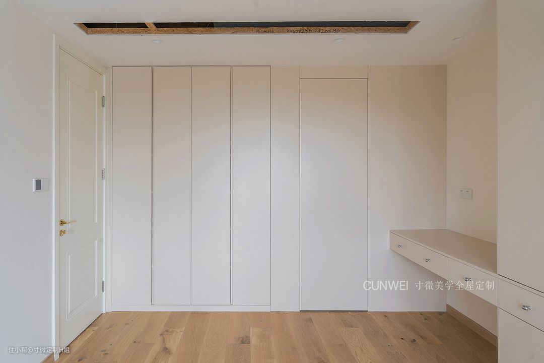 原木衣柜搭配隐形门也是个不错的选择,让卧室的整体感非常好,开放式收纳区内嵌灯带,凸显出精致的居家氛围。