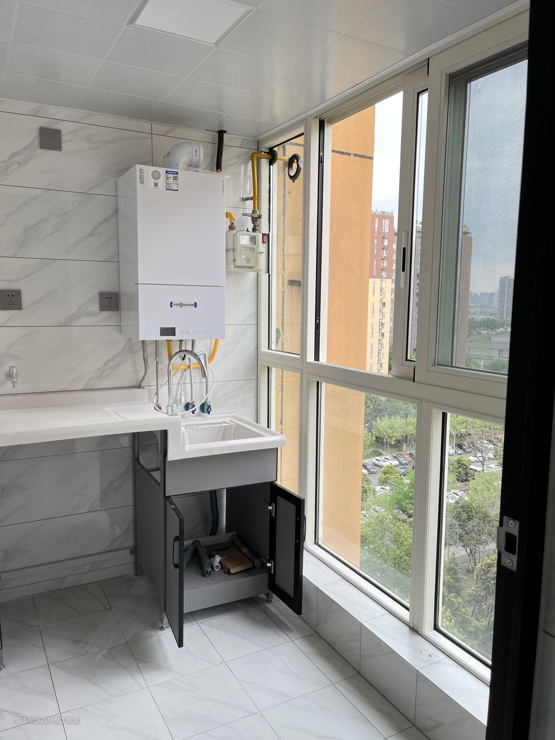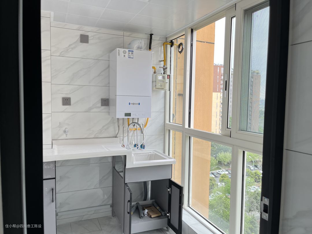 比很多的阳台业主都会改造成一个多功能区,能够做洗晾晒一体的空间,但是很多时候,事情都会变得复杂,叁工曾见过有的人为了阳台放置洗衣机,把阳台空间的整体柜体都拆掉,从基层开始做,真是的费时间又浪费力气。很多现在精装房交房的风格都是现代简约或者现代轻奢,都是比较百搭的风格,阳台的空间也是如此,非常的舒适和百搭,怎样防止家具和软装,都会一种莫名的和谐感和统一感,而不会显得突兀。所以不需要什么墙地瓷砖的改动,整体的空间都会比较靠看,还有就是阳台的空间 一般情况下是安装了地漏的,也就是说是有着下水的空间的,直接定制整墙柜嵌入洗衣机和烘干机,是能够放得下的,但是有人觉得空间不够分割,或者空间太大了,整体想要贴砖,或者做造型,就为了一些小地方的改动,要把整个阳台的空间打掉重装是真的很没有必要的。