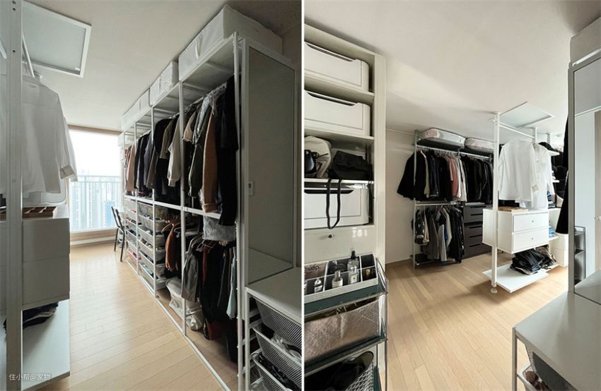 利用货架+收纳篮当衣柜,免去定制柜体复杂的工序,简单又省事;不装柜门,通风透气性好。