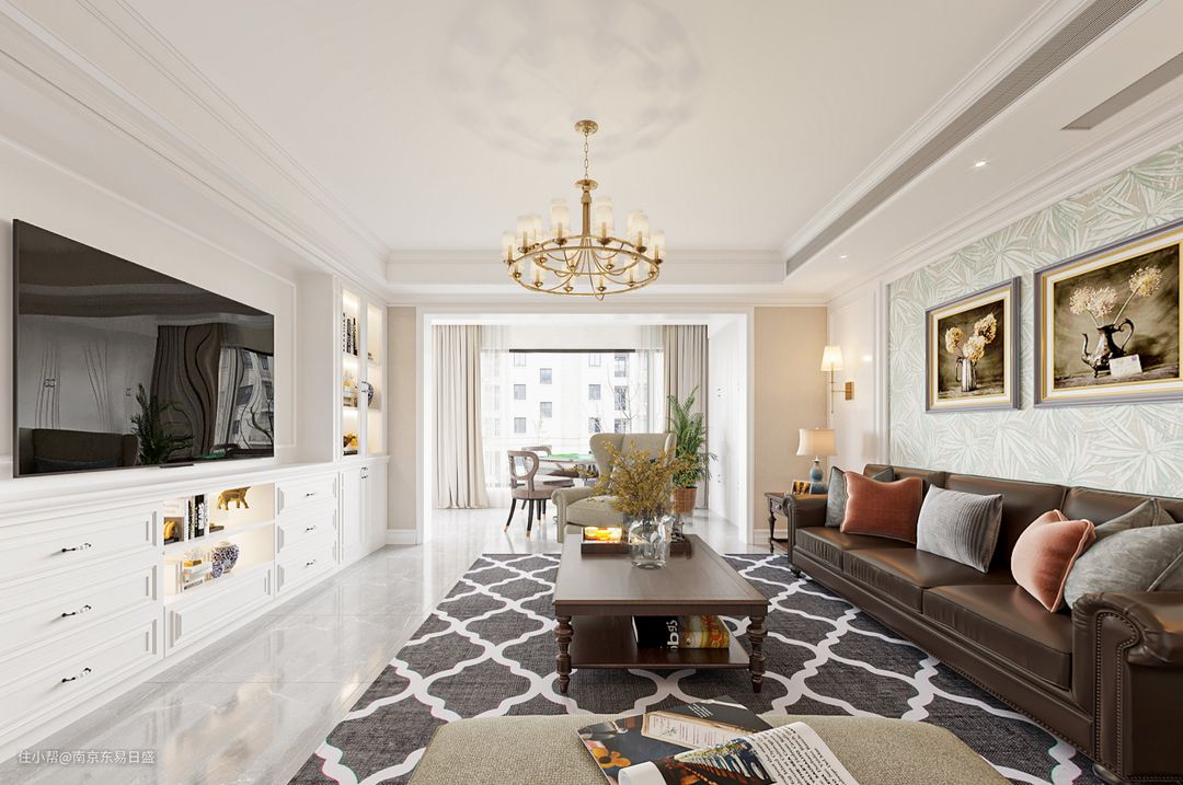 客厅中大方的家居空间,和谐的色彩搭配营造出温馨舒适的环境,带来清爽明亮的视觉感受,暗棕、白色为主的自然色彩,形成很好的搭配。家具宽大、实用舒适。淡色系墙面、天花板、沙发与深色系的茶几、沙发后背墙纸搭配得恰到好处,相得益彰,赋予空间平衡之美。