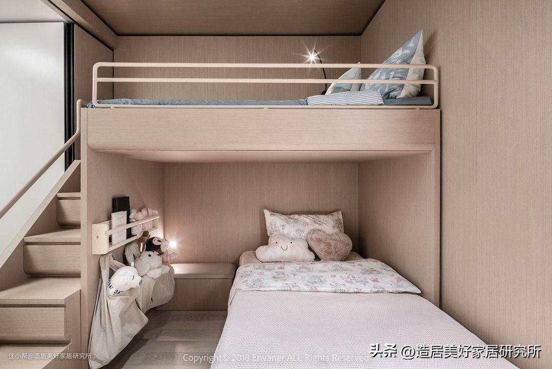 如果房间空间较小,那么光源位置离高低床上铺近是非常常见的,除了所选择的灯具灯光要柔和以外,建议选择无主灯设计,把照明灯光的灯源“化整为零”,不仅灯光柔和舒适也能减少物体的阴影面。