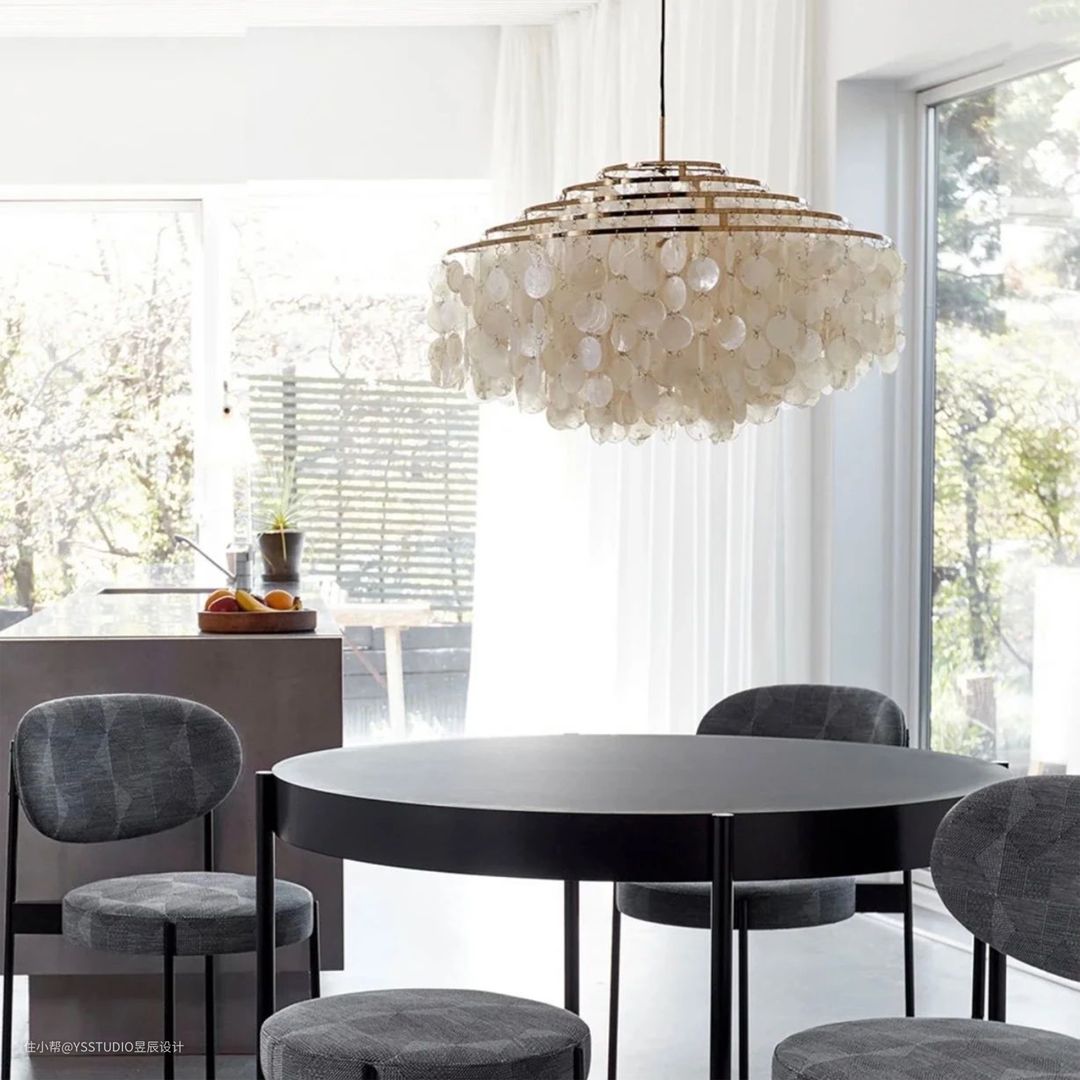 Verner Panton热爱在周围世界寻找灵感,因此有了FUN这一系列的贝壳灯。取材于大自然,珍珠贝母就是最主要的材料之一,由金属环串起这一片片贝母。