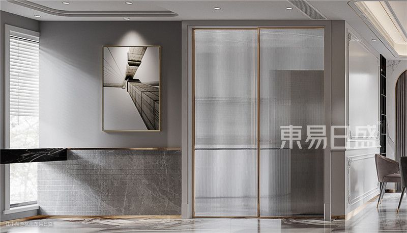 一走进玄关,便能够清楚的感知到浓郁的轻奢法式风格,挂画、移门的设计化解了入户正对厨房的尴尬,只留下一抹淡淡的轻盈和优雅。入户砖一直延续到客厅,起到很好的指示性,使空间各自独立又在视觉上相互连贯。