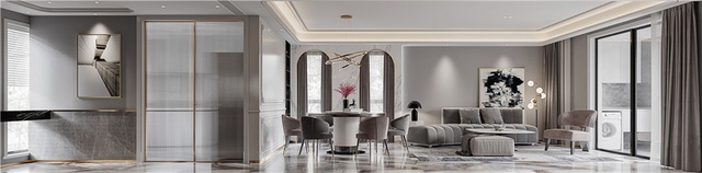 客厅:纯洁的白色护墙立面,拱门、大理石、铜条沙发背景,处处展现着法式时尚与轻盈的面貌;白色与灰色色调充分体现了不使用时安静,热闹时尽显优雅的法式氛围。为了平衡法式风格的繁复感,设计师采用现代简约的顶棚处理,避免线条的累赘以及不好清洁的问题,而且在家具配饰上也呈现了更现代优雅的一面。