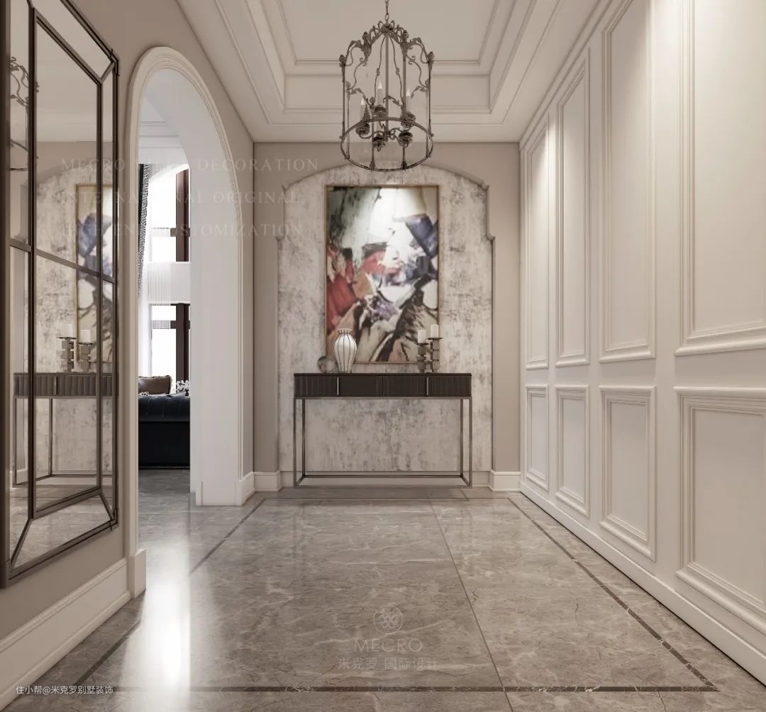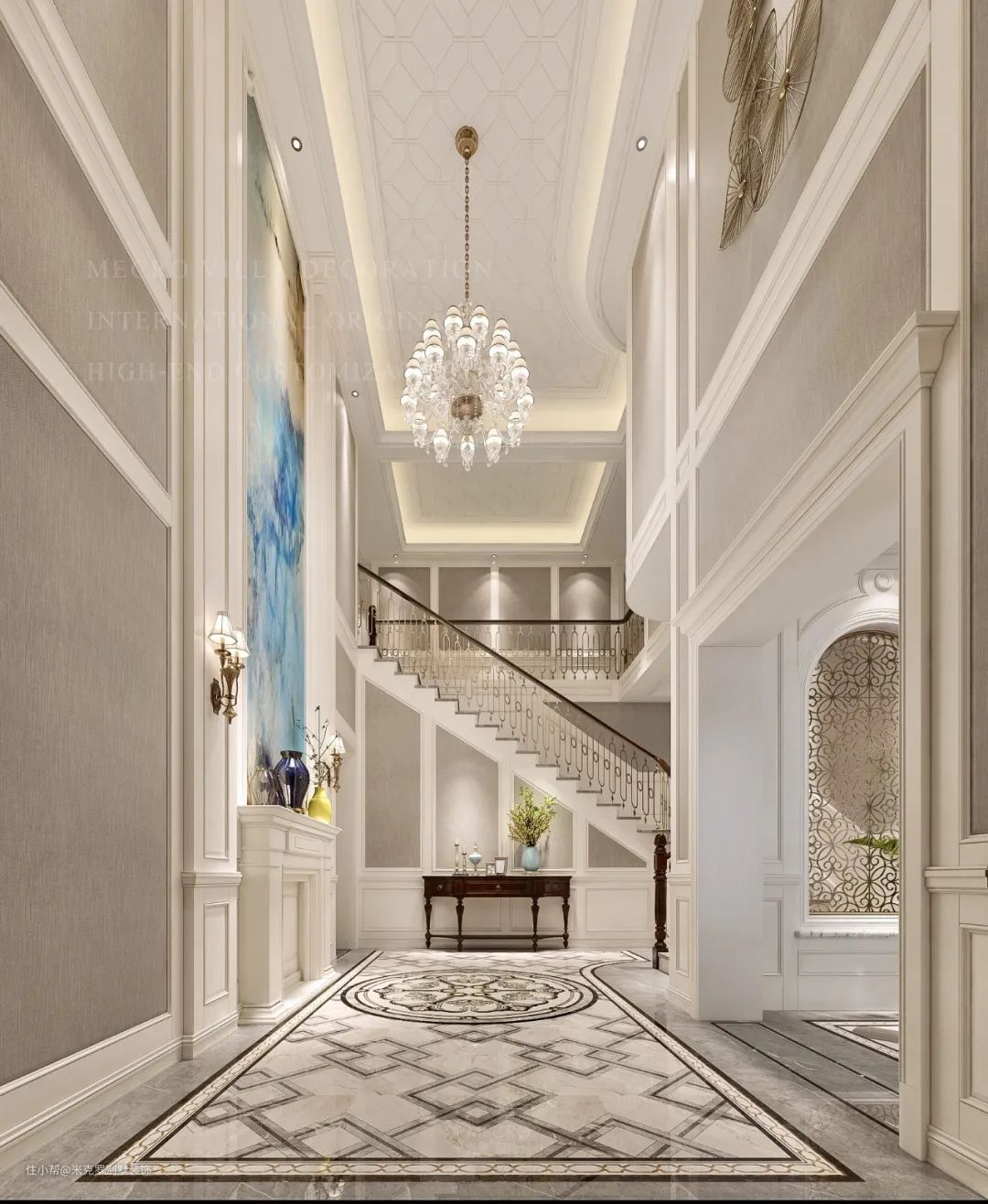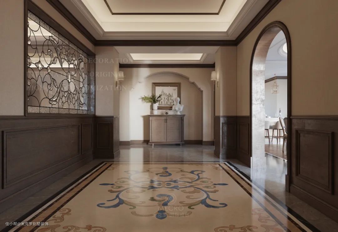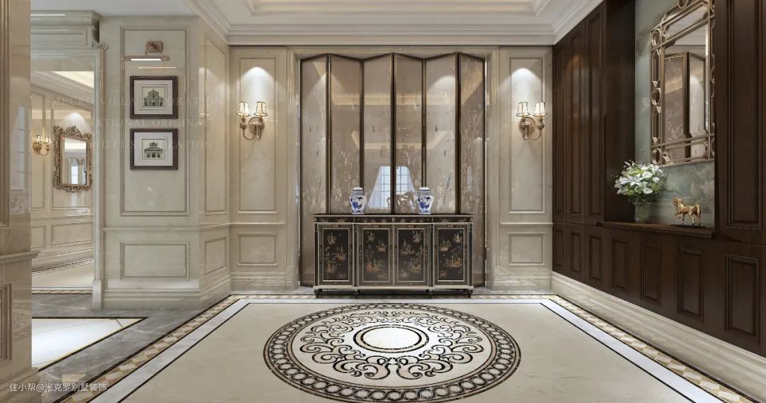欧式、法式或美式的玄关多以繁复花纹、木饰面、金属、吊灯等元素塑造,地面多铺就花纹等装饰,通过设计师巧妙的搭配完美融合出独具一格的玄关风景。