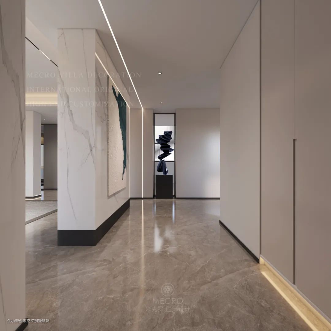 现代简约风玄关设计讲究少即是多,简洁即是丰富。以极少的元素将宽阔的空间填满、表现。