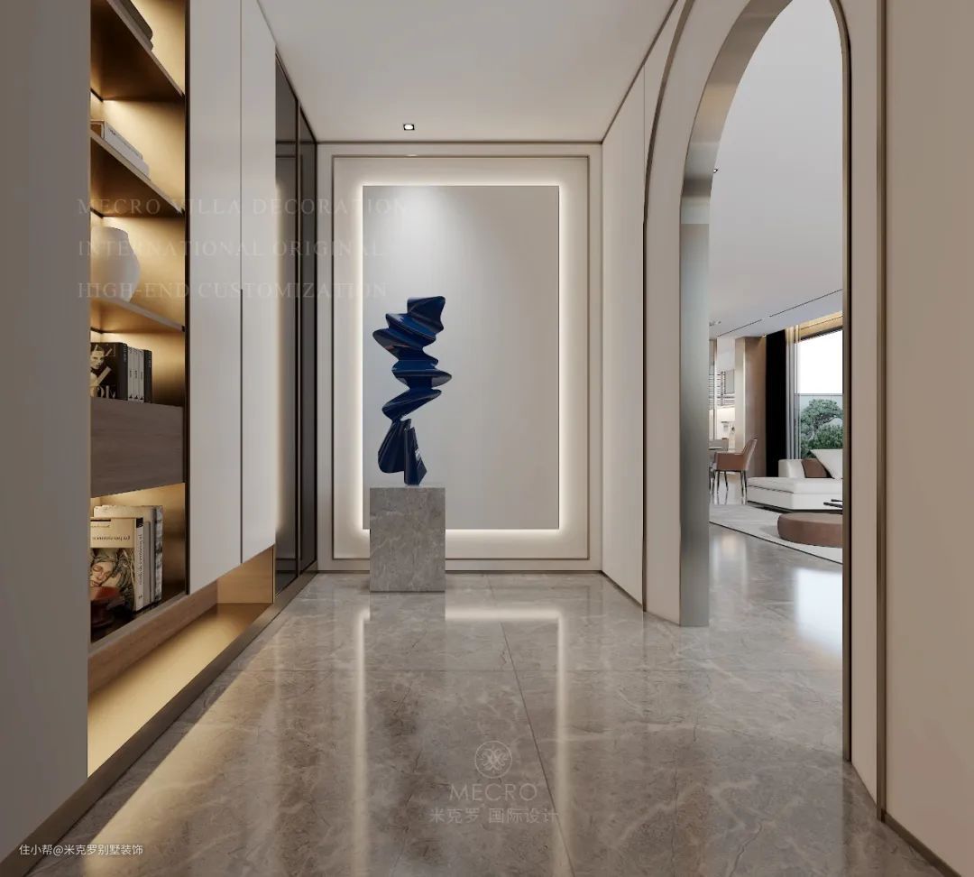 轻奢风格的玄关多以大理石、金属材质为主,或圆或方,于小于大之中彰显着低调而奢华的气质。