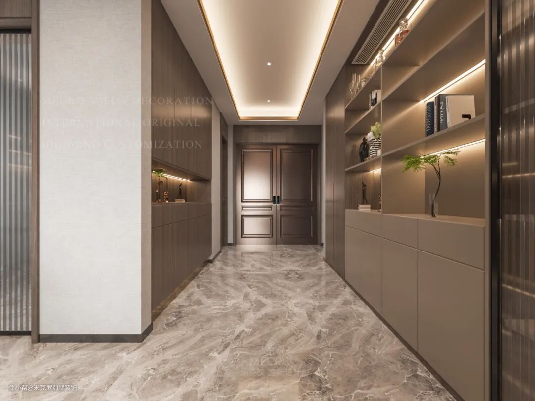 现代轻奢类的玄关用简洁的造型加金属线条,纯洁的质地,精细的工艺为特征进行设计。